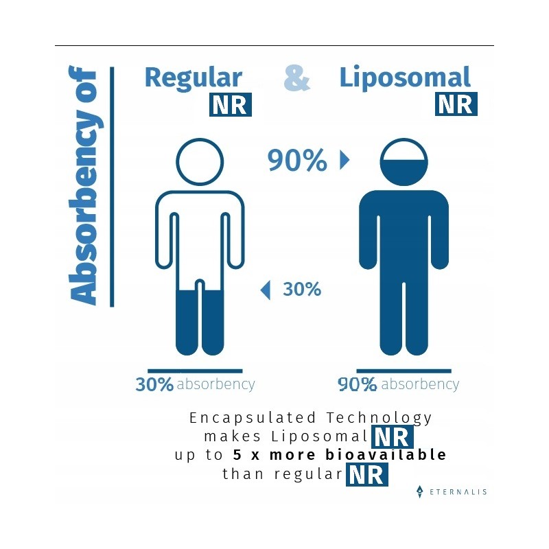 NR liposomalne w połączeniu z Resweratrolem liposomalnym w równych proporcjach, osłonięte lipidowym płaszczem - od 3 do 5 krotnie lepiej wchłanialne od zwykłego NMN z Resweratrolem