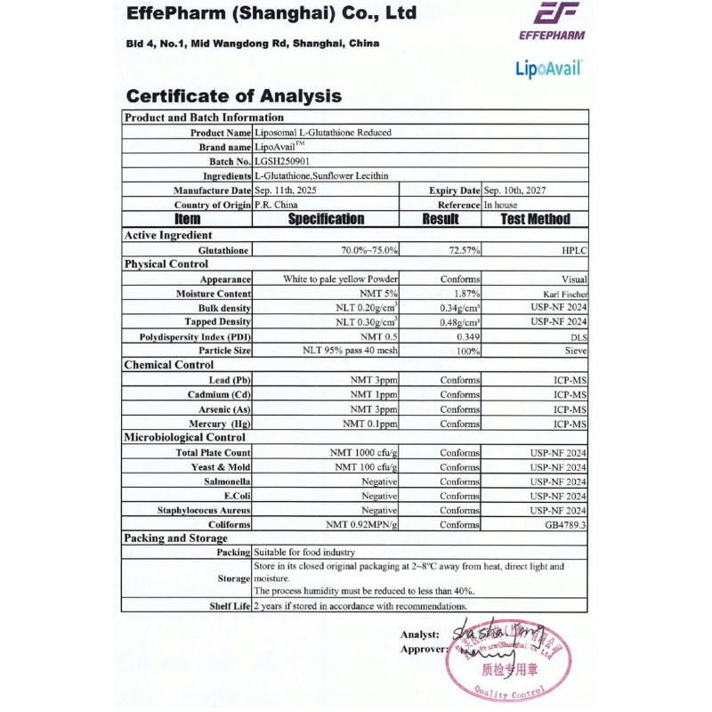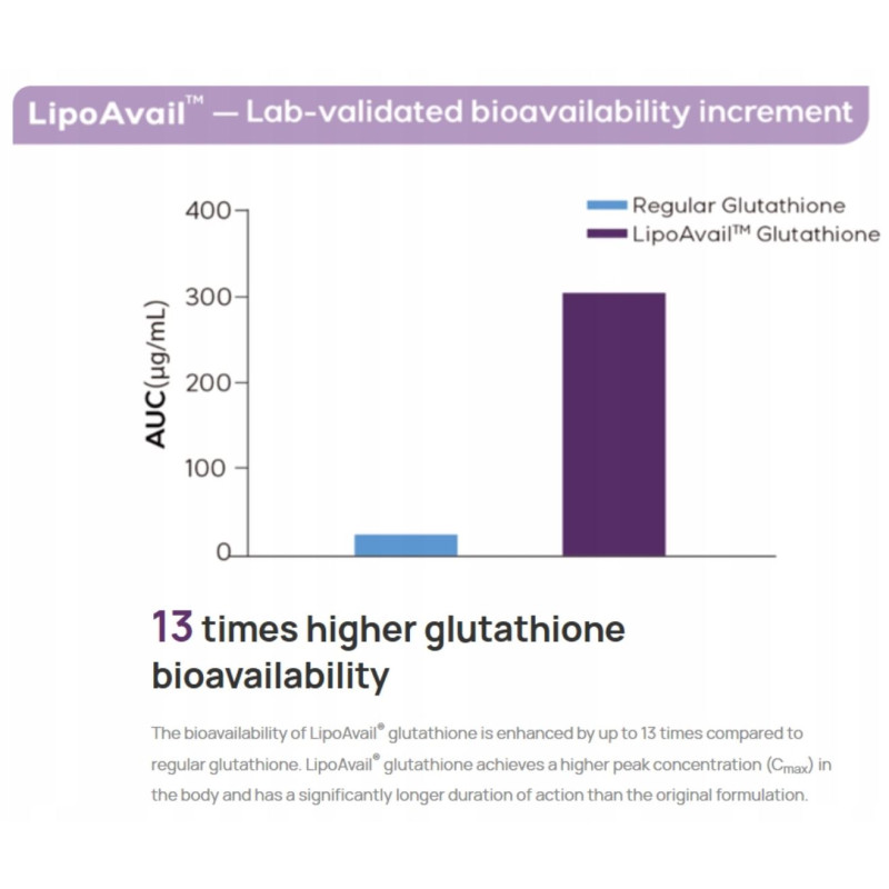 LipoAvail™ to jedna z najbardziej zaawansowanych dostępnych technologii liposomalnych, rozwinięta przez znanego producenta nutraceutyków — EffePharm. Zapewnia bardzo wysoką - ponad 13x wyższą biodostępność (w porównaniu do zwykłego glutationu), stabilność produktu oraz maksymalną ochronę substancji czynnej przed degradacją. To gwarancja jakości, która wyróżnia glutation LipoAvail™ na tle wielu standardowych „liposomalnych” produktów na rynku.